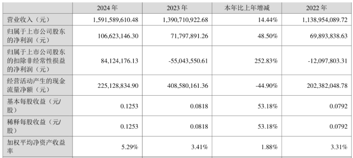 2024年,公司实现营业收入15.92亿元,同比增长14.44%;归属于上市公司股东的净利润1.07亿元,同比增长48.50%;归属于上市公司股东的扣非净利润8412.42万元,2022年、2023年的扣非净利润分别为-1209.78万元、-5504.36万元;经营活动产生的现金流量净额为2.25亿元,2022年、2023年分别为2.02亿元、4.09亿元。